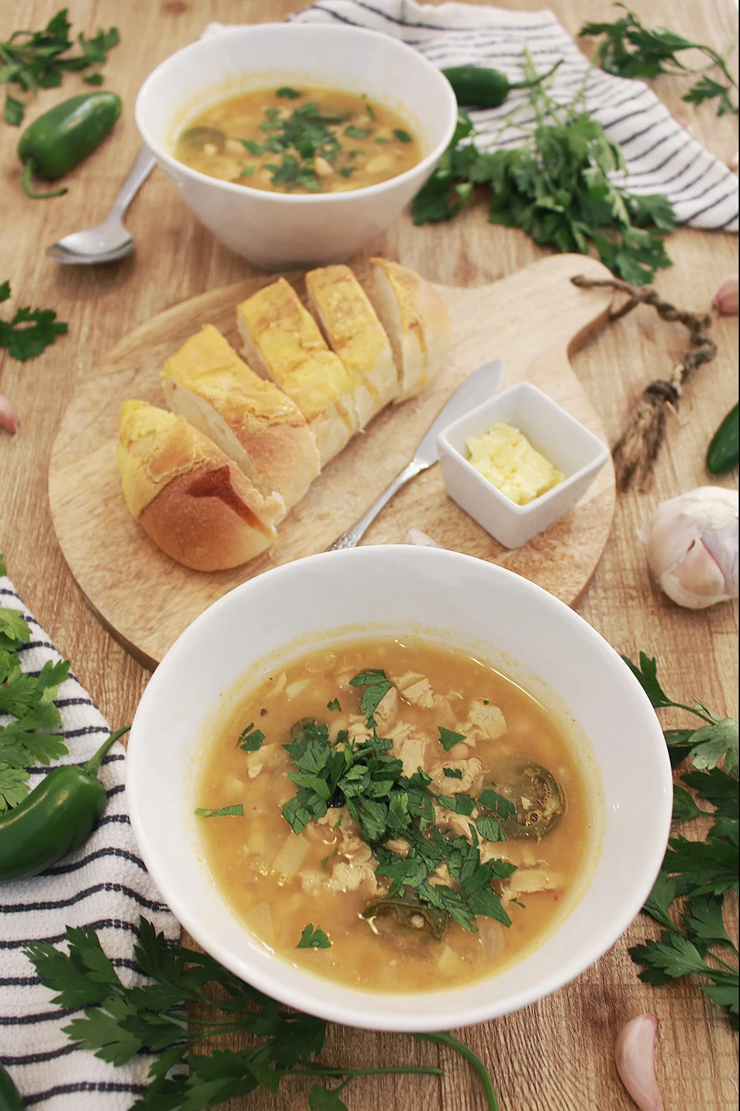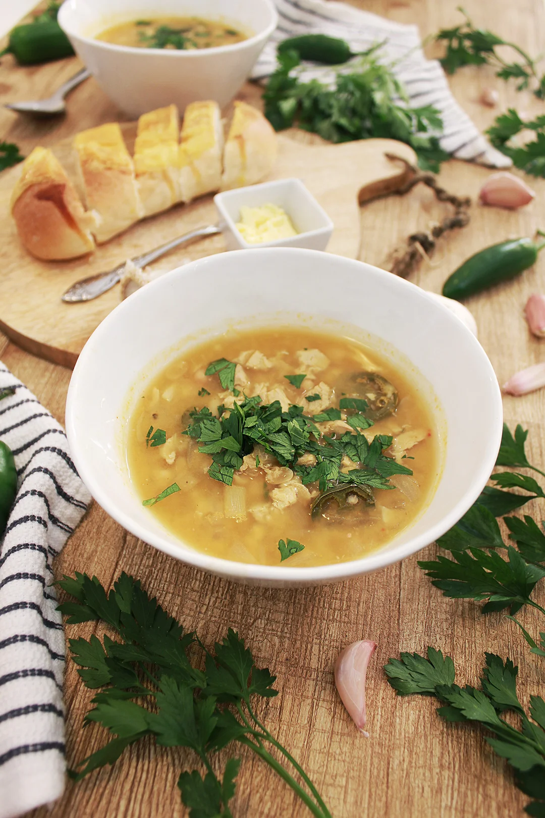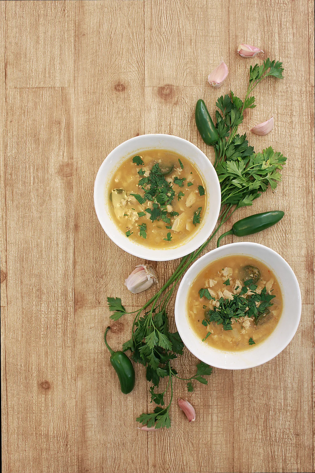 - Start by prepping the ingredients for the chili soup. Wash and roughly chop the veggie chicken meat, jalapenos, onion, garlic, and parsley.